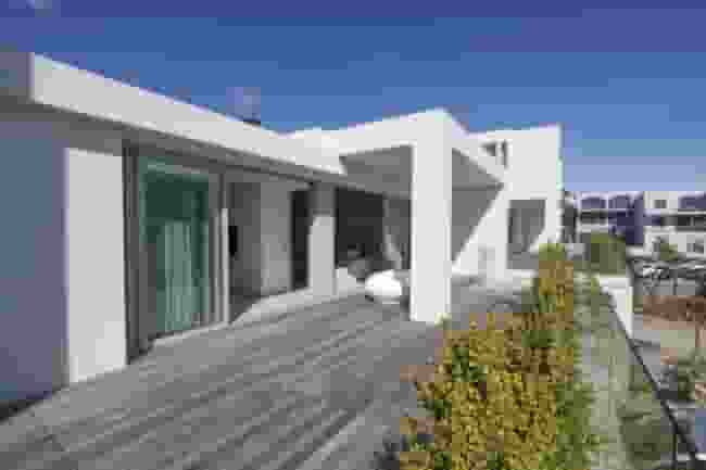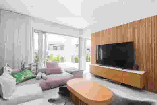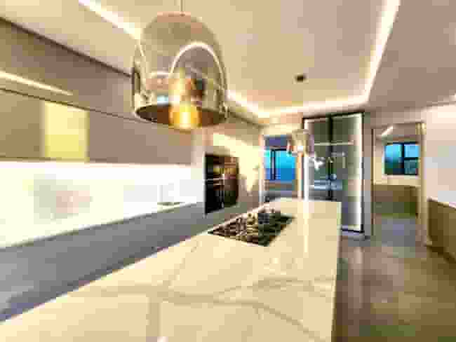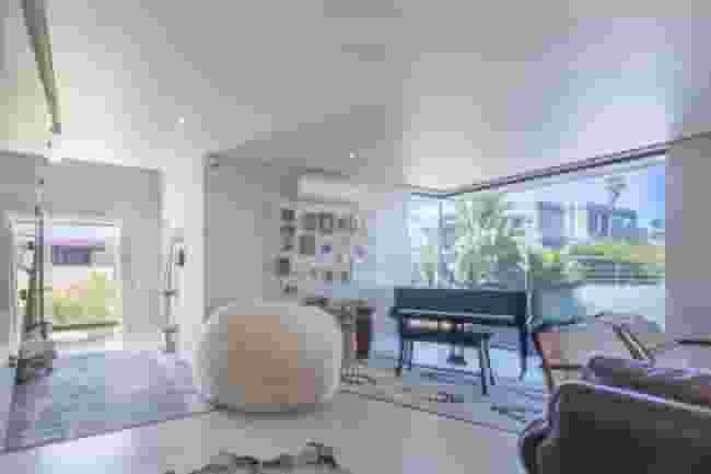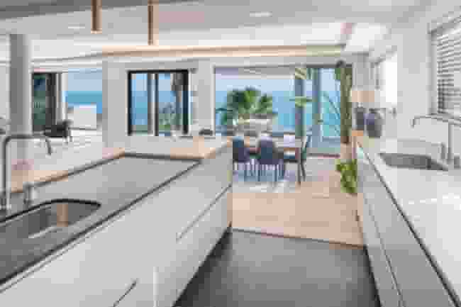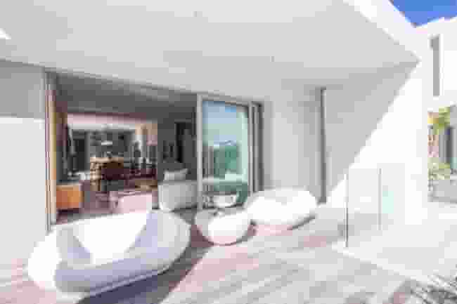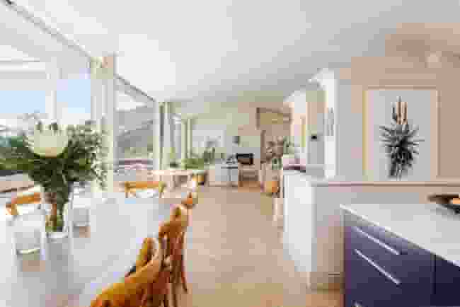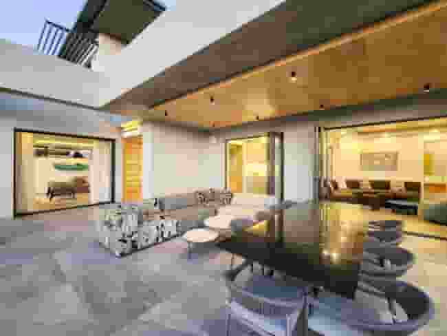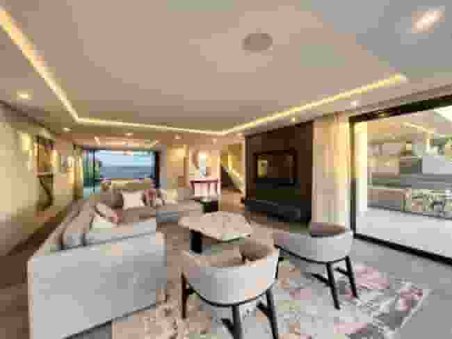 The open-plan layout is central to the home's connection with nature, where large, concealed glass sliding doors and expansive windows seamlessly bring the outdoors in. Inside, minimalist luxury defines the space, with smooth screeded floors and elegant brass accents that give the interiors a sophisticated yet understated feel.