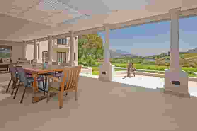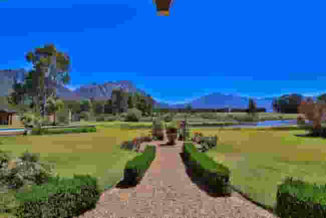 Set at the edge of the Franschhoek Valley, this coveted residence enjoys a dramatic backdrop of fynbos-clad slopes rising behind the estate. From the patio one gazes across vineyards towards the celebrated peaks of the Mont Rochelle Nature Reserve and the rugged ridges of the Franschhoek Mountains.