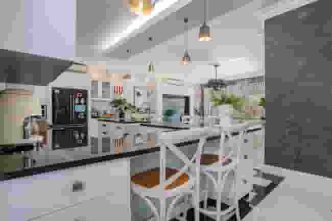 A landscaped fern walkway and portico entrance set the tone, leading to light-filled living spaces framed by floor-to-ceiling glass. The open-plan kitchen and dining area flow into a glass-enclosed entertainer’s lounge that opens fully to the north-facing garden and pool.